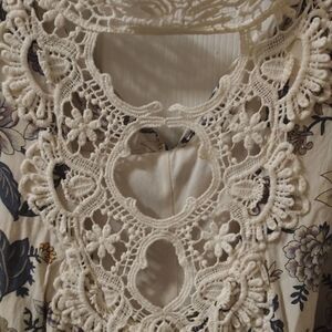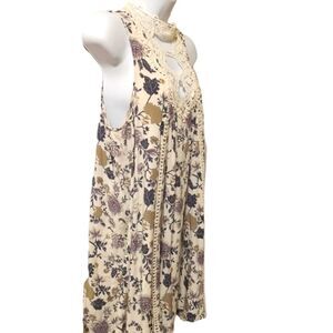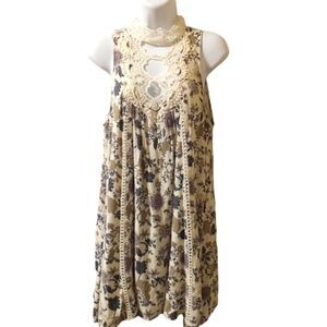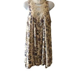Beautiful crochet lace halter neckline, lovely floral print mini dress tunic sleeveless fully lined button keyhole back closure size M measures flat 19" pit to pit 34" long NWOT boho lace floral tunic mini dress