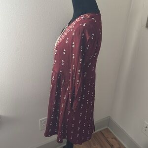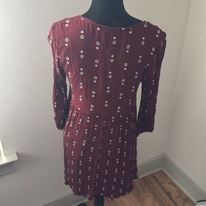 Entro burgundy 3/4 sleeves split collar ties tassels Boho dress Sz S