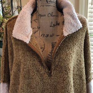 Tan/cream soft, half-zip pullover, gold zipper, long sleeve with gathered cuff, toggle at hem for ability to gather, VERY soft, fleece-like material- polyester