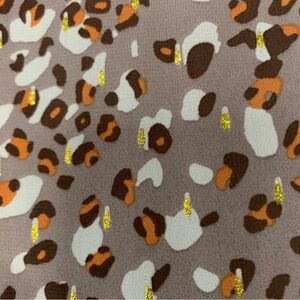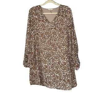 Entro flowy shift dress in a taupe mauve gray with leopard print in brown, orange and cream with hints of gold. It has a vneck and long peasant elastic cuff sleeve. Tags: trending, date night, girls night out, leopard, metallic, shower, relaxed fit. Size M