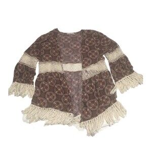 Entro wrap Women's Large brown open front cream lace inserts fringe Boho Coastal
