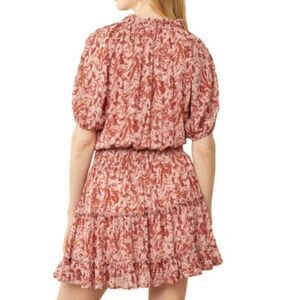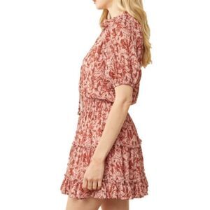 With its striking print and timeless shape, Entro's puff-sleeved dress with tiered ruffled skirt adds feminine, versatile appeal to your wardrobe. The bold print, the ruffled collar, the slightly puffed sleeves are all features that grace this stylish women's mini dress. It also has smocking at the waist, a tie at the neck, and it's lined. This is a pretty piece that will earn you compliments aplenty.