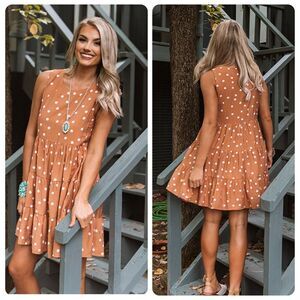 Upgrade your "chic supply" of fall shift dresses with this rust colored beauty featuring lightweight flowy material patterned with white polka dots, a high rounded neckline, wide 4-inch sleeveless shoulder straps, and a relaxed tiered silhouette that falls into an uneven mid-thigh length hemline!