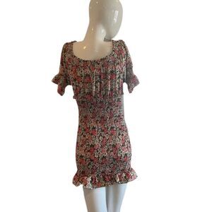 Multi-colored daisy pattern smocked sundress. Elastic/ruffled sleeves. Ruffle hem. Stretchy elastic throughout. Elastic neckline. Can be worn on or off the shoulder.