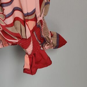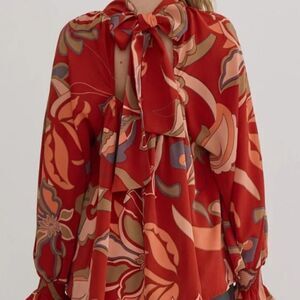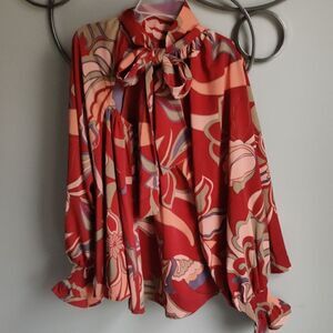 This beautiful top features a beautiful print, silky silhouette, mock neck and bow tied in back! It is in like new condition... only worn once. Make a statement pairing it with jeans, shorts, skirt or pants. Size S. Retail $98.