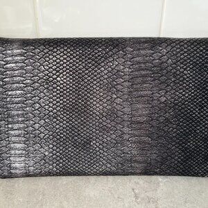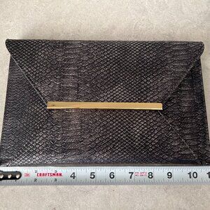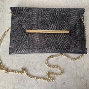 This super chic envelope clutch can transform to a cross body or shoulder bag with the detachable gold chain. It's got a metallic silver grey black embossed faux leather. Gold hardware and envelope style closure.