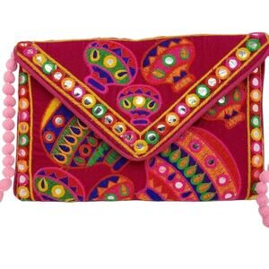 Envelope Purse with Embroidered Colorful Latern Pattern and Pom Pom Strap