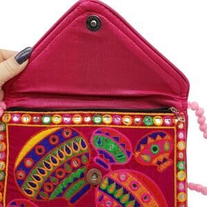 Envelope style purse with colorful stitched laterns with metalic circles through out the purse