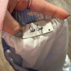 Blue and white pattern foldover envelope skirt. Built in shorts and stretchy waist in the back