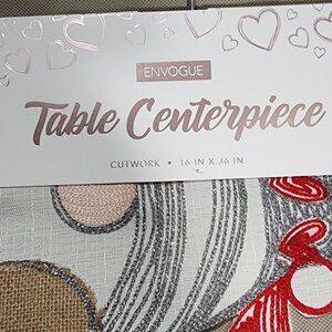 This gnome-themed table runner by Envogue adds a whimsical touch to your dining decor. The cutwork design features love-themed motifs in red, beige, and gray hues. Crafted from 100% polyester, it measures 16 inches by 36 inches, providing an ideal fit for most tables.