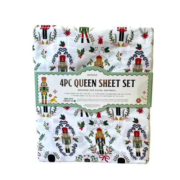 Celebrate the season in style with this Envogue Queen 4-Piece Christmas Nutcracker Sheet Set. Featuring a charming holiday Nutcracker pattern, this festive bedding set includes one flat sheet, one fitted sheet, and two pillowcases made from super soft brushed polyester for cozy comfort all winter long. Perfect for adding a cheerful holiday touch to your bedroom décor, this set is brand new, machine washable, and imported. Bring warmth, comfort, and Christmas spirit to your home with this adorable Nutcracker queen sheet set.