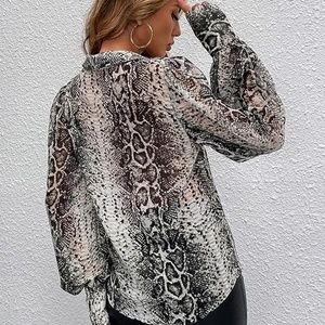 Envy Me black, gray and white Snakeskin-patterned long-sleeve blouse, featuring button closures and a collar. 100% polyester, Chiffon material, and a size Large as it runs small. The blouse/shirt is somewhat sheer and can be worn with or without a tank underneath depending upon the occasion. It is suitable for a variety of settings and is machine wash. Very good condition.