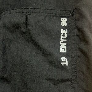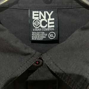 Black button-down long sleeve shirt with the Enyce logo on the right shoulder. Features a front pocket with a second zippered pocket underneath. The pocket reads "19 ENYCE 96." A Sean Combs Co. made of 55% cotton and 45% polyester.
