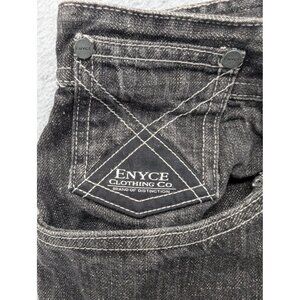 Branding: ENYCE script embroidery inside waistband; ENYCE Clothing Co. leather patch at back; ENYCE triangle woven patch on back pocket; branded rivets/buttons
