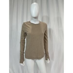 Enza Costa 'Cashmere' Tan Easy Cuffed Crew Size M: ribbed neckline and cuff, thumbhole detail, thin jersey fabric.
