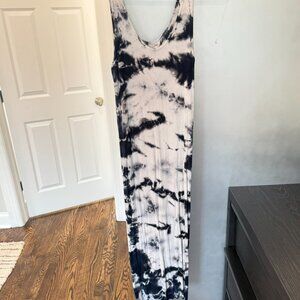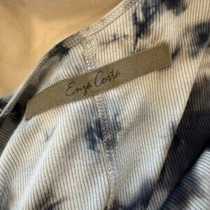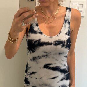 Enza Costa sleeveless ribbed tank midi dress in blue and white tie-dye. Features a scoop neckline, bodycon fit, and soft stretch fabric that flatters the figure while keeping it comfortable. Perfect for layering with a denim jacket or wearing on its own from day to night. Excellent condition. Size Medium.