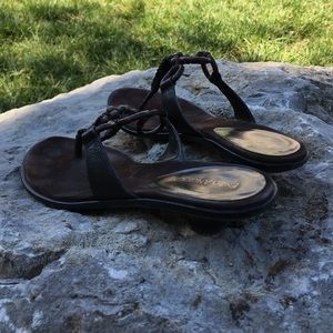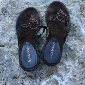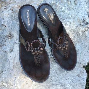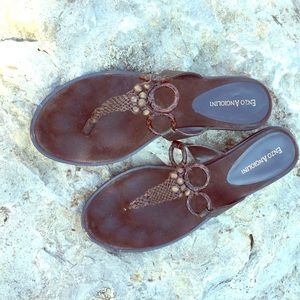 1" block kitten heel thong sandal. Wood, macrame and bead detailing on the top of the sandal. Barely worn!
