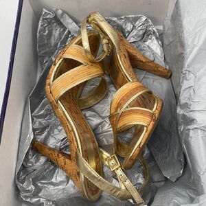 Enzo Angiolini Bamboo Easenya Open Toe Heels Leather Gold Natural 6.5