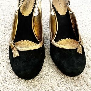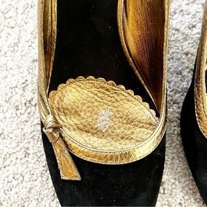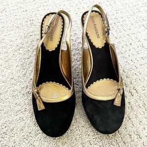 Enzo Angiolini Black Suede Leather Slingback Heels Sz 9.5 Pump Gold Metallic Bow