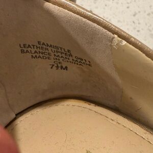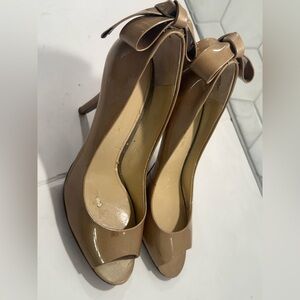 Enzo Angiolini Bow Back Champagne Gold Peep Toe Patent Leather Stilettos Sz 7.5