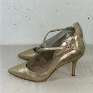Keywords: gold heels, metallic heels, pointed toe shoes, ankle strap heels, party shoes, occasion shoes, enzo angiolini heels, gold dress shoes, women's heels, dressy heels, cross strap shoes, formal heels, metallic gold, leather heels