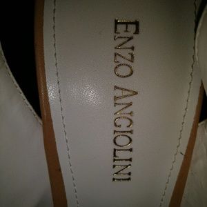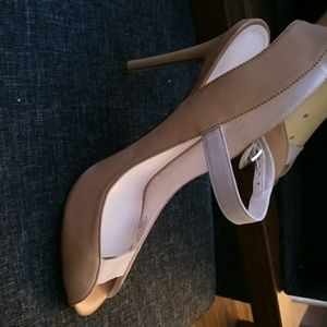 3 inch Enzo Angiolini peep toe Heels in tan and white. Cute heel cutout in the back, nice detail of extra strap that covers the buckle holes.
