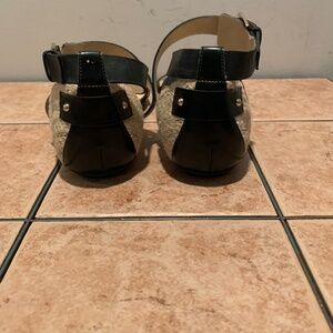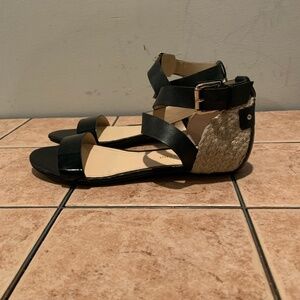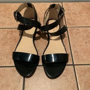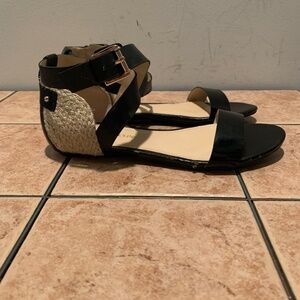 Enzo Angiolini Katrynn Sandals in black with jute espadrille trim in back. Leather and textile upper. Criss cross adjustable ankle straps. Women's size 7.5. The leather at sides have wear but otherwise good condition.