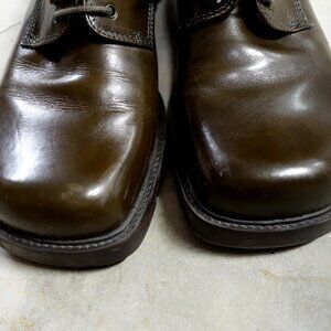 Retro Thick leather Boxy toe Good tread on soles Small amount of cosmetic scuffing (enhanced in photo #7, but doesn't actually show too much, as in the other photos) Excellent condition Color is brown with a greenish hue. Please note that I price carefully and generally do not consider offers, unless for *bundles on two or more items* made via the offer button. Happy hunting!