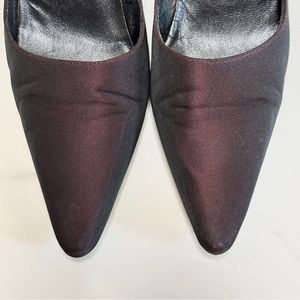 Beautiful deep burgundy fabric with a matte black sheen, hard to describe but so elegant. Thin ankle strap and pointy toes create sleek, feminine lines. 3.5” heel. Leather soles, perfect for the dance floor. Excellent preowned condition.