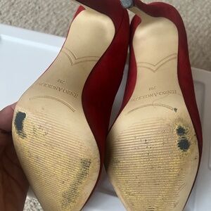 Size 7 red suede pointy heel 4 inches used twice minor scuffs comes with clear bin