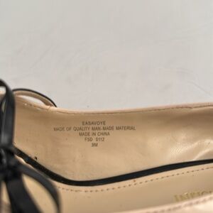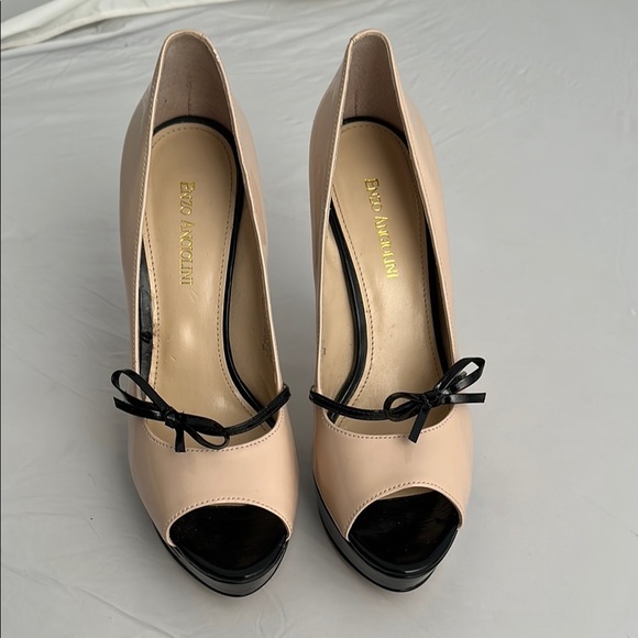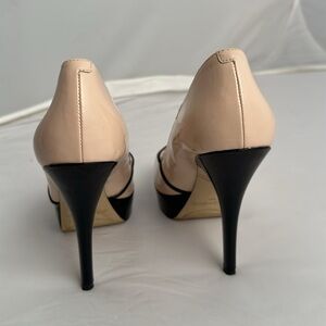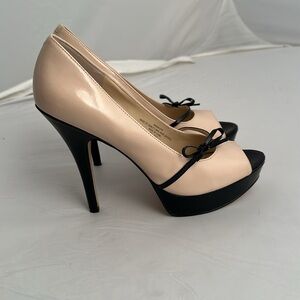 Enzo Angiolini Savoye nude and black patent leather platform open peep toe pumps. Approx five inch in stiletto heels. Essential sophisticated style with a whimsical skinny contrast bow across the toe area perfect for work or fancier special events. Versatile to transition from day to evening. Very good condition. They’re also relatively easy to spot clean. There was some small black scuffs on the side from being stored next to black heels and it came off pretty easily. That is unusual for patent leather. Smoke free home