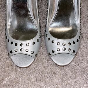 Enzo Angiolini Silver Studded Open Toe Stilettos, size 6M. Silver color with silver metal studs. Open toe, leather upper, 4” heels. Some signs of wear but still in great used condition.