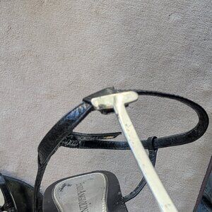 These black and chrome strappy heeled sandals from Enzo Angiolini are a fun and unique addition to any wardrobe, though they no longer fit my wife. They have some wear in the footbed and near some of the strap holes as is visible in the pictures. Also a small spot where the chrome came off on the metal link (detail picture) which is visible in a close inspection. They are priced accordingly.
