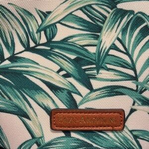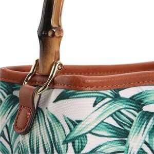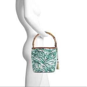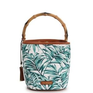 Tenli bucket bag from Enzo Angiolini. This handbag features an eye-catching tropical print & faux bamboo handle for an island-inspired finish. Removable shoulder strap so this can be used as crossbody or satchel. Little gold feet on bottom. Roomy.