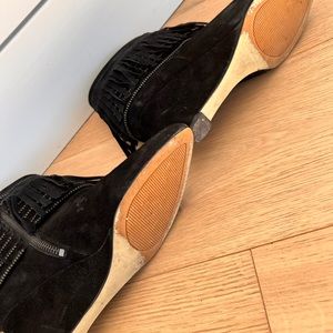 Enzo Angiolini suede like, leather upper wedge bootie with zipper and fringe detail. Size zipper. About 3” heel