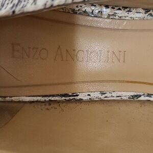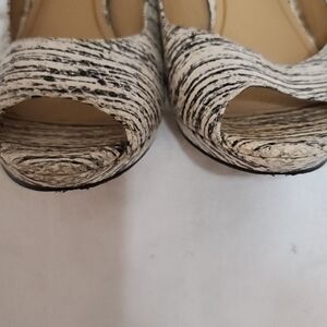 Enzo Angiolini peep toe pumps. Black and ivory distressed stripes. Leather uppers. "Eagelabelles" style(?). Slight wear toes and left heel. See pics. Heels approximately 3 inches. Gently worn, good condition. Size 7 1/2. (S47)