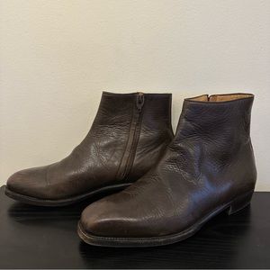 It’s a pair of brown horween hatchgrain leather boots with side zip, soft leather lining, and Vibram rubber sole. Hand-welted in Italy by Enzo Bonafe, a small family-run workshop in Bologna.