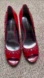 Enzo Angiolini Studded Peep Toes. Candy apple red patent leather with studded detailing. 3.75” heel. Studs and eyelets are muted brass.