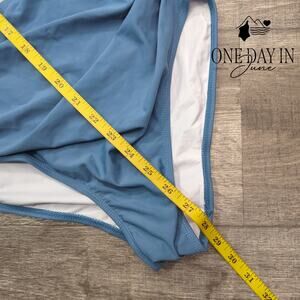 A most becoming one-piece in the most agreeable shade of blue, featuring a delightfully modern cross-front design with artful cut-out details that would surely turn heads at any seaside gathering. The clever construction of polyester and spandex ensures both comfort and a most flattering silhouette for the discerning lady. This charming piece arrives in pristine condition, ready to accompany you on your next aquatic adventure with all the confidence of a true heroine.