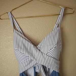 Stylish one-piece swimsuit with a striped top and solid bottom. Perfect for beach days.