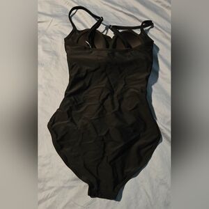 This classic black one-piece swimsuit features thin spaghetti straps and a square neckline, offering a flattering silhouette with its side ruching. The subtle textured fabric provides a contemporary yet modest look, perfect for swimming and beach activities.