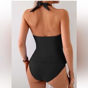 Dive into style with this elegant black halter tankini swimsuit. Perfect for a chic beach look.