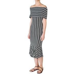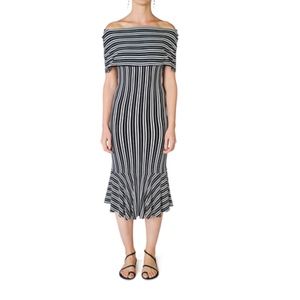 Beaufille's Eos off the shoulder dress, crafted of a lightweight ribbed stretch-knit, has a comfortable, fitted silhouette with a feminine kick flare hem.