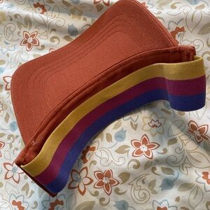 Excellent condition unisex, one-size-fits-most-adults theme park visor hat. Issued for the 35th anniversary of Epcot (making hat circa 2017). Elastic band in excellent shape with no warping or other signs of wear. Embroidered EPCOT 35 with slightly raised printed logo. Reddish brown hat with warm colors striped band. From a smoke-free, cat-friendly home.