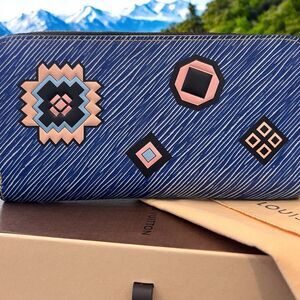 This is an authentic LOUIS VUITTON Epi Azteque Zippy Wallet in Denim Light. This sophisticated clutch wallet is crafted of textured epi leather in blue with an azteque print. The wrap-around zipper opens to a black leather interior of card slots, flat pockets and a zip coin compartment.
