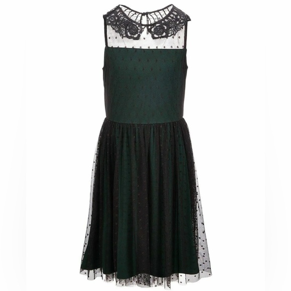Classic Swiss dots decorate the mesh overlay of this chic dress by Epic Threads, highlighted by a lace collar.