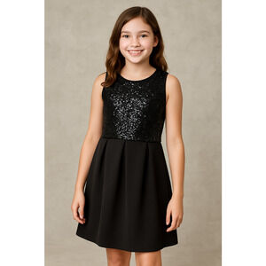Beautiful black dress by Epic Threads, girls’ size Medium (8–10). The top features shimmering black sequins for a fun, festive look, and the bottom has a smooth, pleated skirt for a classic silhouette. Perfect for holidays, parties, birthdays, or special events.