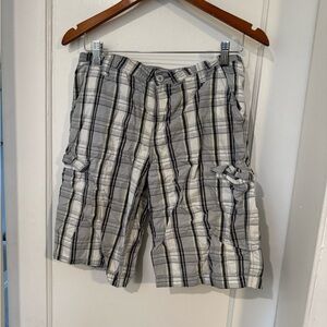 These Epic Threads shorts feature a stylish gray and white plaid design, perfect for a casual summer look. The lightweight fabric and elastic waistband with a drawstring ensure comfort and ease of wear. Ideal for warm weather, these shorts offer a relaxed fit for everyday activities. Bin 10 item 33.