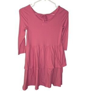 Adorable pink dress with tiered design. Soft fabric and comfortable fit. Ideal for casual outings. Tie detailing in back.