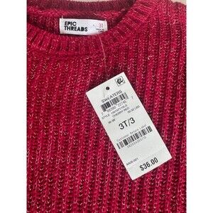 The Epic Threads Sweater for girls in size 3T is a stylish pullover designed in a vibrant cherry red color. Made from knit fabric, this sweater is perfect for the back to school or holiday seasons. The brand, Epic Threads, ensures quality and a trendy style that is sure to make your little one stand out in her outfit.